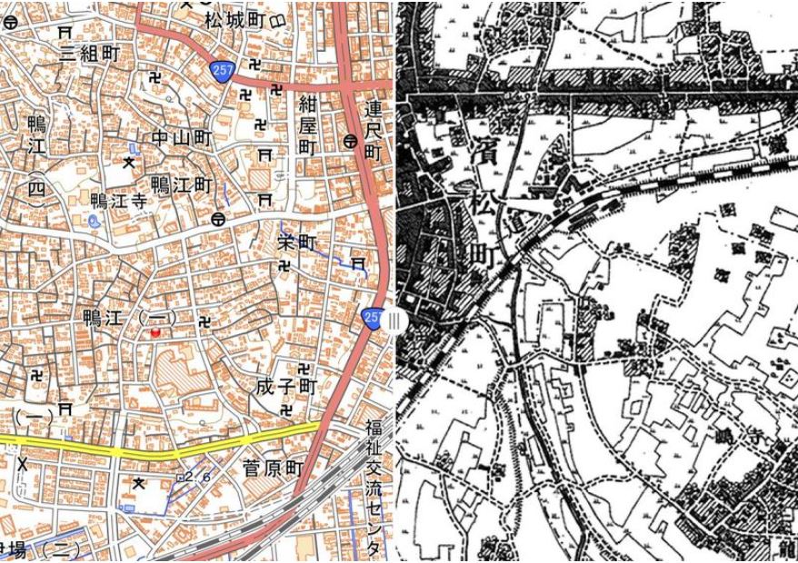 今回、紹介する機能は、マップ画面を2分割(範囲は任意指定できます)して、左側に現在の地理院地図、右に明治22年(1889年)の地図を表示しています。