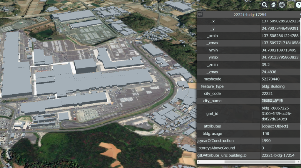 湖西市も、このプロジェクトに基づくデータが公開されています。湖西市のデータには、建築物の3Dモデルや道路、土地利用の詳細な情報が含まれており、これを活用することで、都市のインフラや計画の理解が深まります。