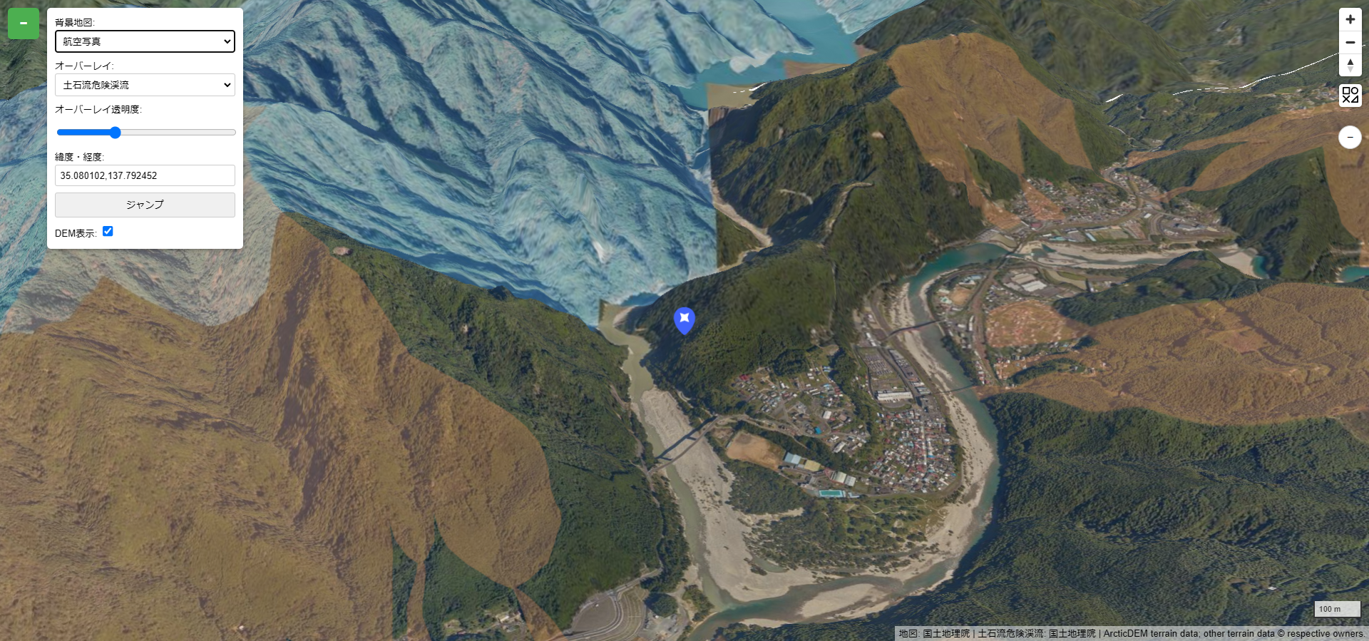 - 地形の可視化: デジタル標高モデル(DEM)に基づき、リアルな地形の起伏を表現。